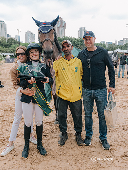 Sofia Negrão Moreira comemora com sua família e equipe a vitória na categoria Amazonas A sobre o dorso de Zahara