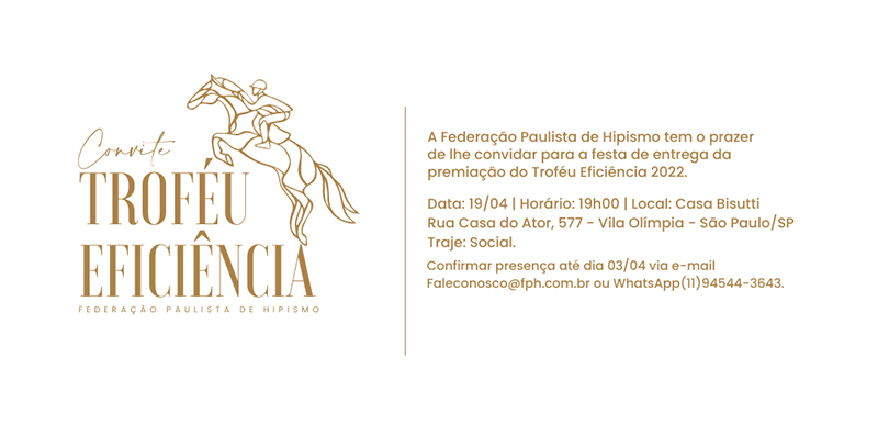 A Federação Paulista anuncia com grande honra a realização de mais uma noite de celebração do melhor do hipismo paulista, o coquetel de entrega do Troféu Eficiência 2022.