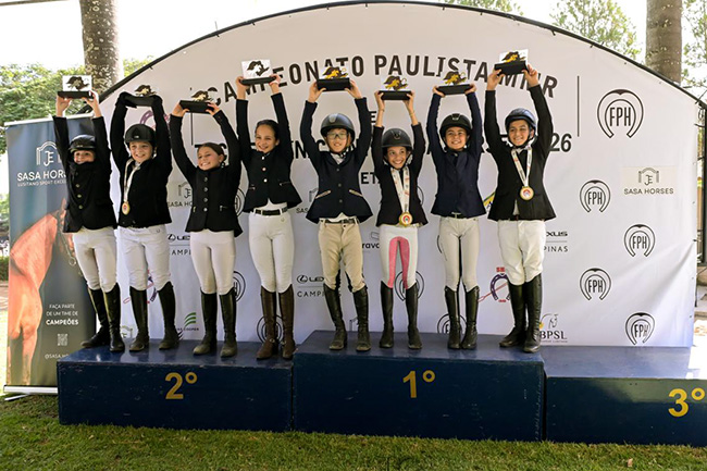 Entre os 17 conjuntos da categoria Mini Mirim, o título paulista ficou com Theo Baccelli Foresto, 11 anos, montando Kaulin das Umburanas, que garantiu a vitória ao marcar apenas 0,43 de aproximação ao tempo ideal no desempate entre quatro concorrentes que terminaram o campeonato sem faltas.